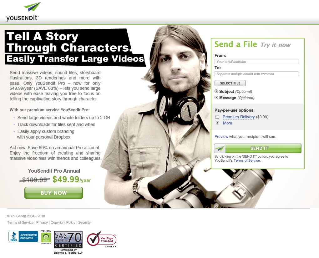 If you are like most designers you have an innate desire to share large graphic files. In the last 12 months 26,570,220 graphic design files were shared with YouSendIt – in their original format to help inform, persuade and sell to an audience. You can share large design files including: psd, tif, tiff, png, cdr, bmp, ai, jpeg, jpg, fig, mov, powerpoints and eps files. Only YouSendIt Pro now for only $49.99 (Save 60%) gives you a simple user interface, advanced security settings and a confirmation receipt to send large creations without reducing file size.
